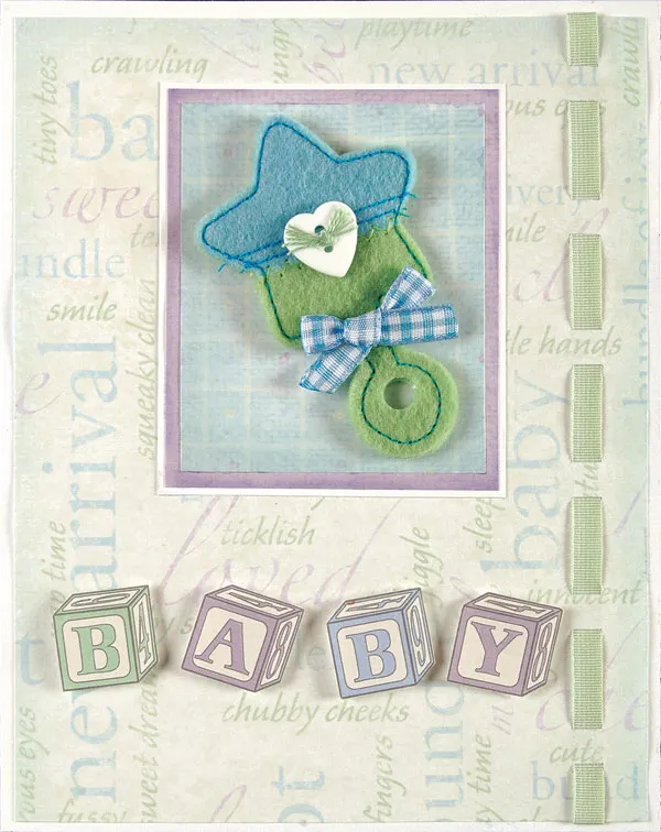 Cut a 2 ¼”x2 ¾” piece of the blue mesh paper and chalk the edges blue. Mat it on lavender paper and chalk the edges with lavender. Mat again on white. Glue the matted piece to the words piece, positioned as shown. Adhere the rattle in the center of the blue mesh paper.