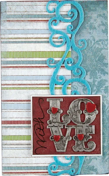 Cut a 2 ½”x2 ¼” piece of red textured paper and mat it on white cardstock. Use the pen to write “with” vertically along the left end of the piece. Attach the LOVE Brad Buddy on the right end. Add foam tape to the back on each end, then attach it to the card front ¾” from the lower edge.