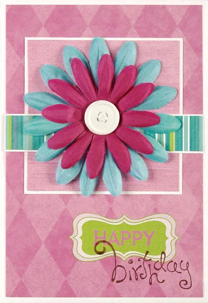 Stack a 2 ½” fuchsia flower on a 3 ½” wide teal flower and attach them to the square with the button brad. Glue the diamonds piece centered on the blank card front. Attach the “happy” sticker below the flowers and stamp “birthday” overlapping it as shown.