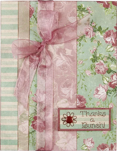 For the inside: Cut a 5”x2” piece of the pink stripes paper. Stamp the “thanks” border across the stripes repeatedly, varying the placement of the stamp. Trim it to 4”x1 ¾&rdquo,; ink the edges, and mat it on burgundy. Ink the edges.