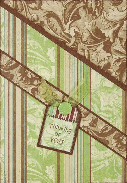 Cut a 6”x 5/8” strip of brown brocade and mat it on brown. Glue it angled across the striped piece, 1 ¼” from the upper edge. Trim the ends. Cut out the tag and mat it on brown. Stamp “thinking of you” on the tag. Knot the ribbon and position it on the tag. Use the brad to attach the tag and ribbon to the striped piece, angled as shown. Glue the constructed stripes piece to the blank card front and ink the sides and bottom edges.