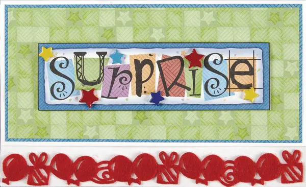 For the card front: Cut a 6 ¼”x2 ¾” piece of green stars paper and mat it on blue. Glue this piece centered on the card front. Cut out the “surprise” art and add the star brads to it, placing them as shown. Add foam tape to the back and adhere it centered on the card front.