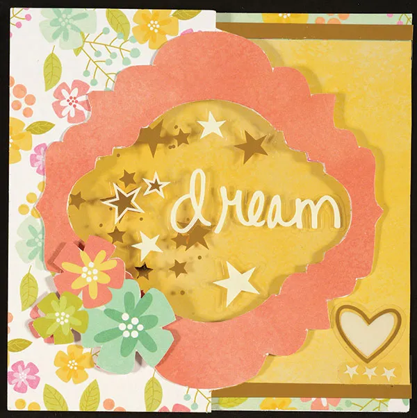 Card front: Place a blank card with the fold on your left. Cover the left side with a Snap Pack flower paper. Cover the opening in the label with a gold star overlay. Position the stars on the left side. Glue in place, and trim the excess. Cover the largest label with a Snap Pack dark peach paper, and foam tape in place over the overlay. Place the Dream sticker and the white star stickers on the overlay.