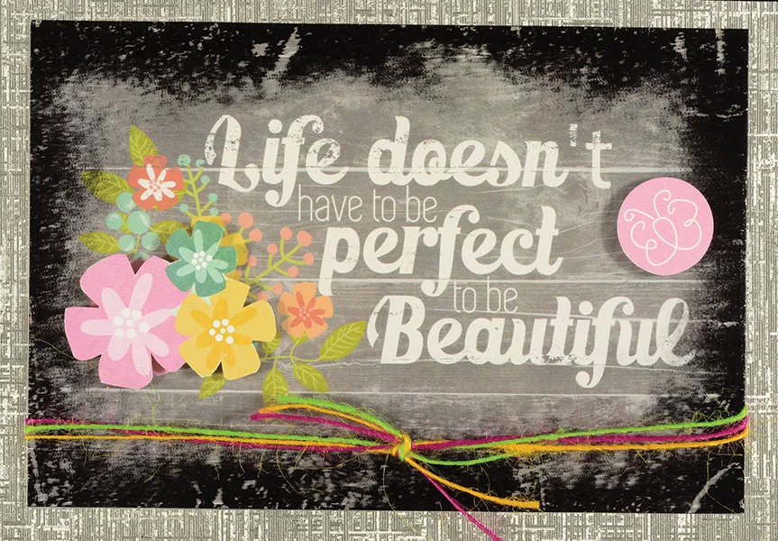 Card inside: Glue a Large Distressed Overlay centered. Glue a 5”x3 ½” Silver Linen Holographic paper centered. Glue a Small Distressed Overlay onto a Snap Pack small sentiment. Wrap three strands of jute around the bottom, and make a knot. Glue to the card centered.