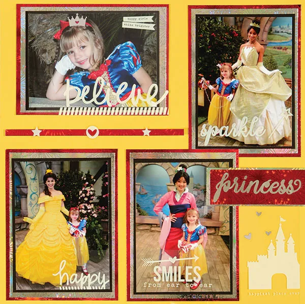 Glue a 6¾” x1/4” strip of red fireworks paper under the top left photo. Add the stickers as shown. Place the “princess” on a 3 5/8”x1 3/8” red fireworks holographic paper. Mat on silver fireworks holographic paper with 1/8” borders. Foam tape on the right.
