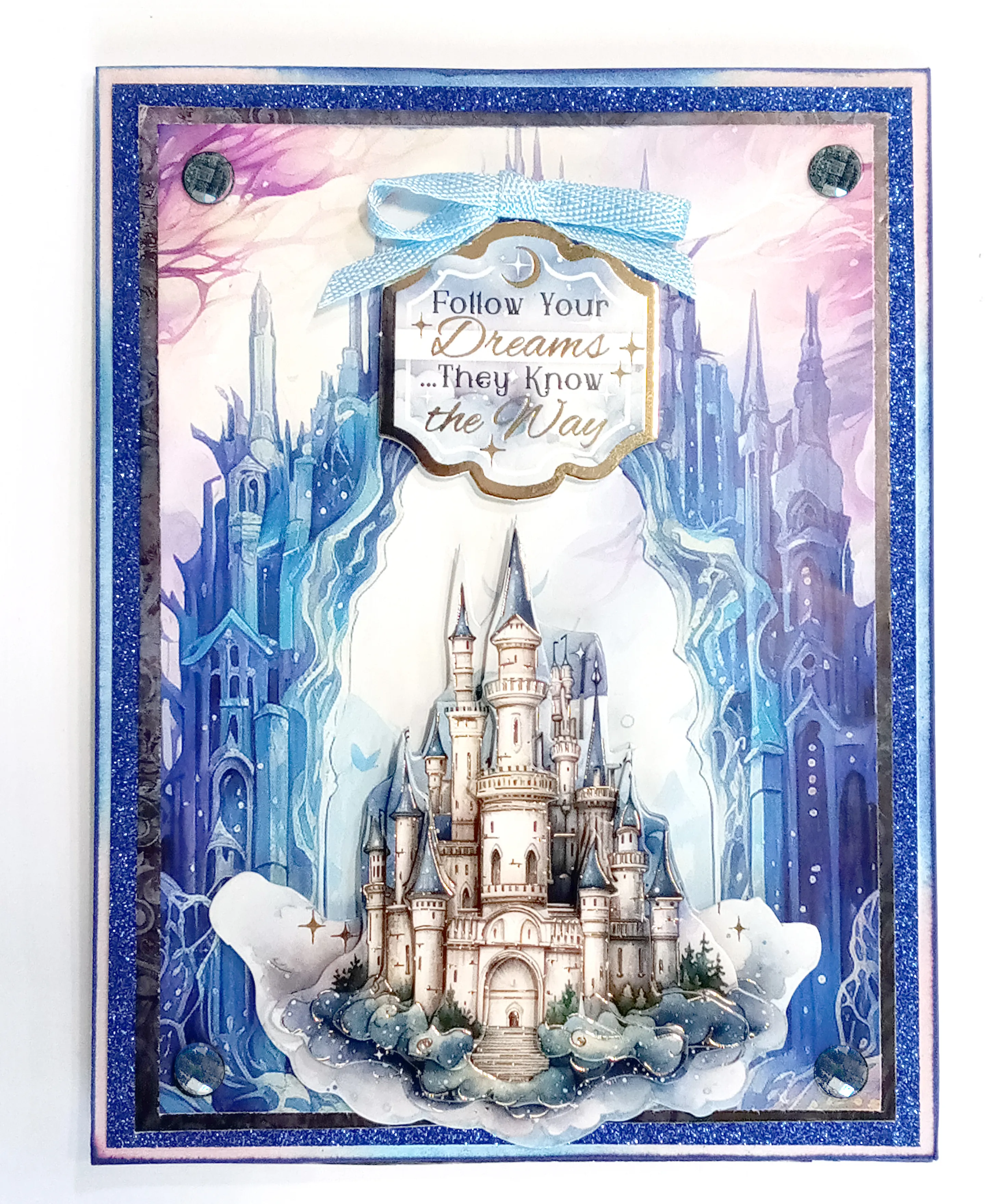 Foam tape "Follow Your Dreams They Know the Way" Topper sentiment at the top as shown. Make and Zot™️ a 2" light blue bow above it. Place a blue Diamond Sparkle in each corner of the arched castle's background paper.