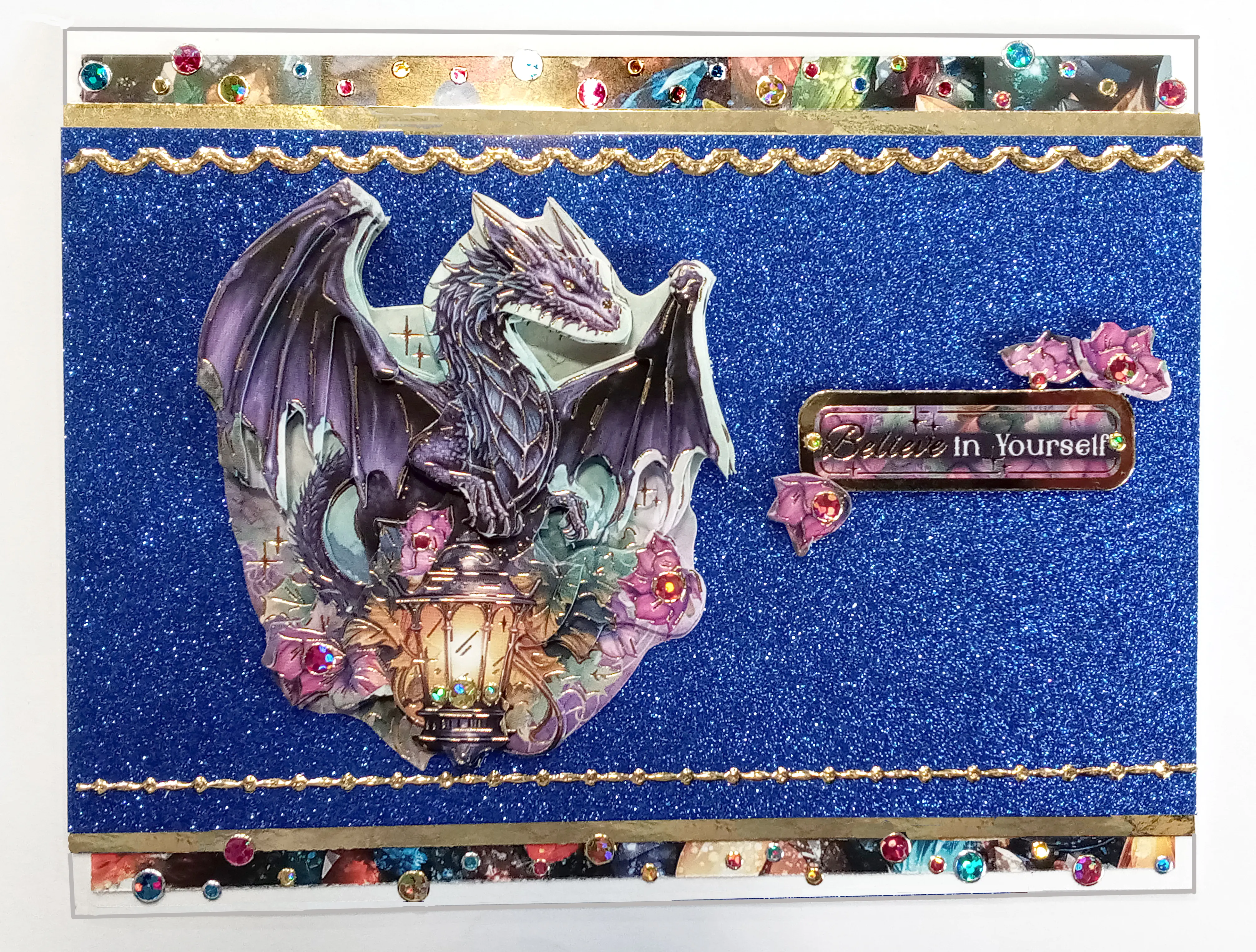 Save the two individual lamp decoupage layers for the inside of the card. Glue the large dragon onto the card. Foam tape the other layers as shown. Foam tape the "Believe in Yourself" Topper sentiment to the right of the dragon with three of the remaining flowers as shown. Place gold Jewel Dazzles™️ onto lantern and pink Jewel Dazzles™️ on the flowers as shown.