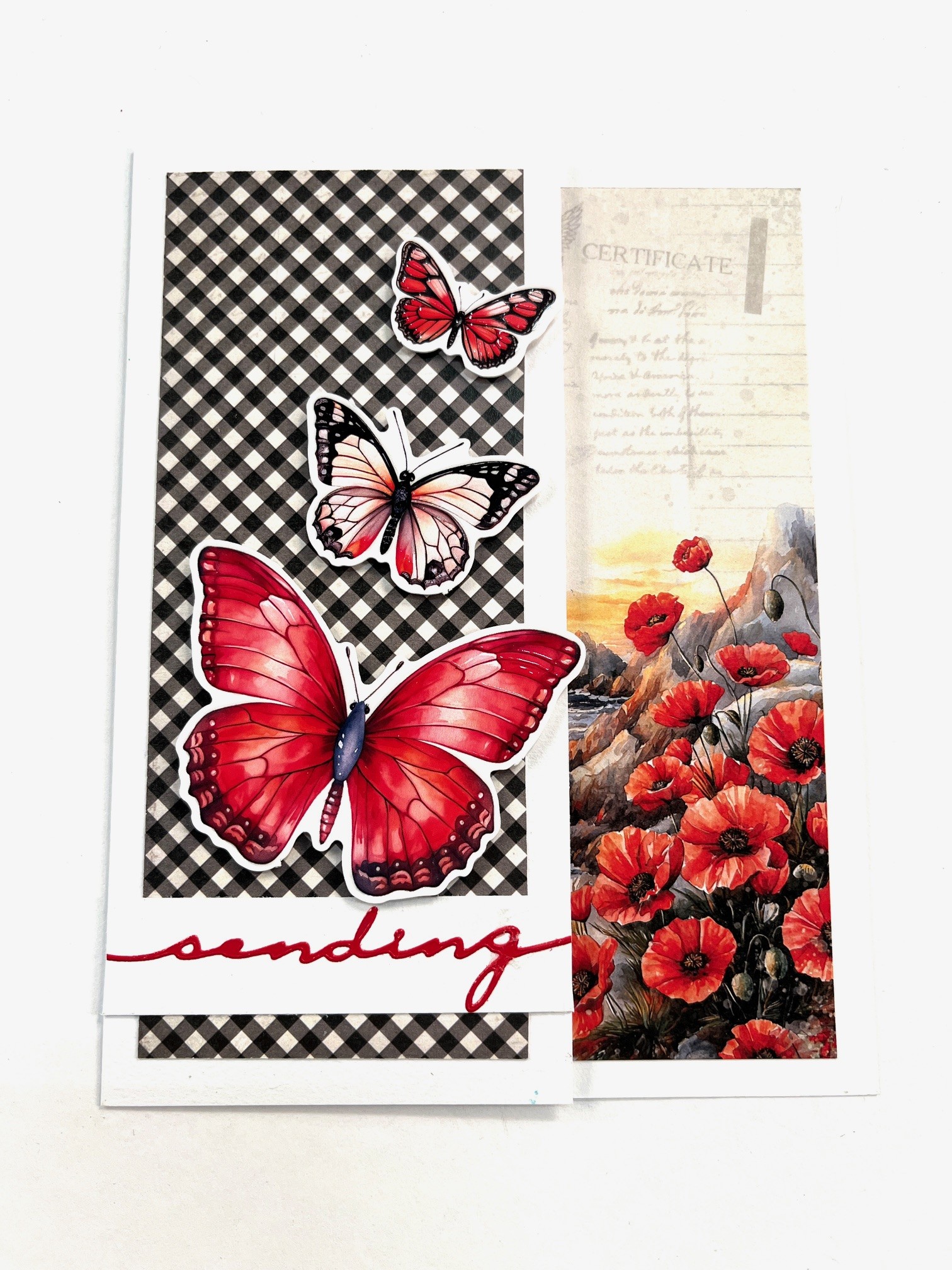 1. Cut 2” off the card front. Glue 2 ½”x6” black gingham to the card front. Foam tape three die-cuts as shown. Glue 3”x3/4” white cardstock (from the cut off piece) below the largest butterfly. Place “sending” from the red script greeting Dazzles™ on the strip.