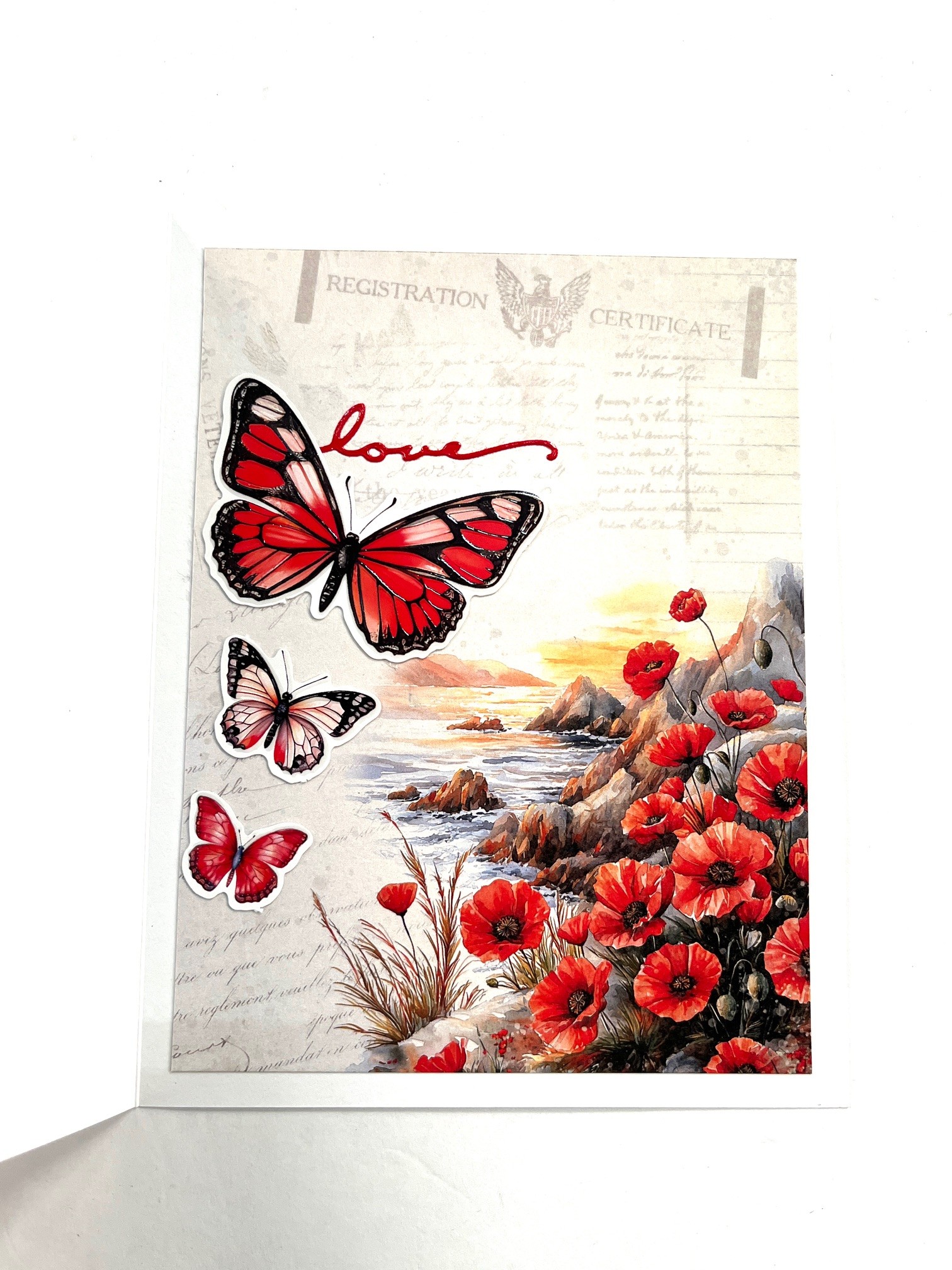 2. Cut the seashore paper to 4 ½”x6” and glue inside the card. Glue three die-cut butterflies as shown. Place red “love” as shown.
