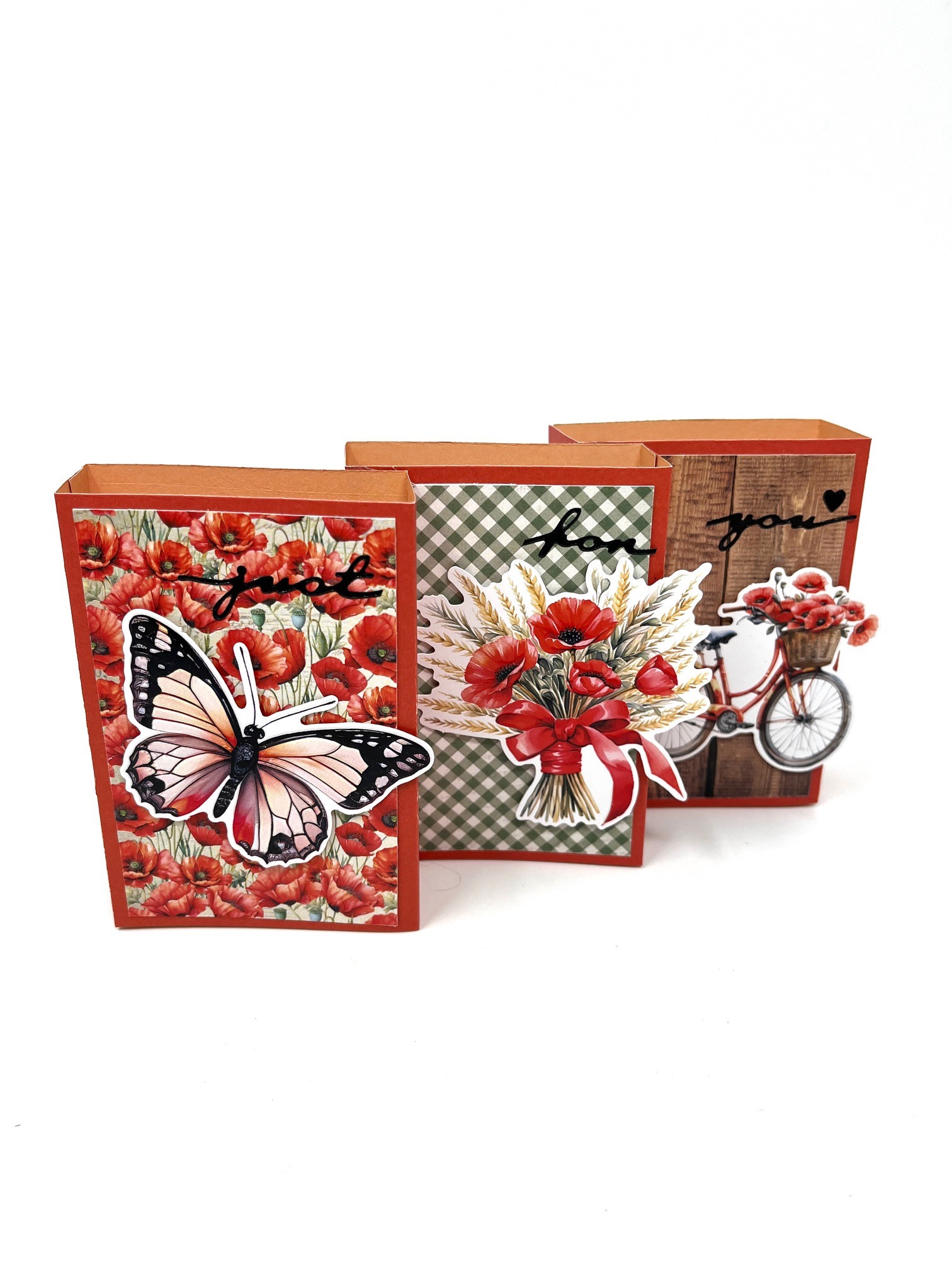 1. Use the Triple Box Card die with red Poppies Solid Cardstock to make three boxes following the direction on the die package. Cut 2 ½”x3 ¾” pieces of poppy flowers, green gingham and wood Poppy Garden papers. Glue one to the front of each box. Attach with extra sticky tape as shown in the package directions.