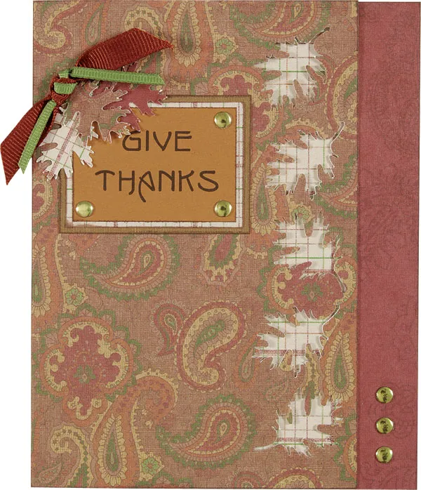 Punch one leaf each from rust paisley, brown paisley, and plaid. Glue them at the upper left. Hold the two ribbons together and knot them. Trim the ends, then glue the knot over the stems of the leaves as shown. Add three gold nailheads to the greeting and three more near the bottom of the rust strip as shown.
