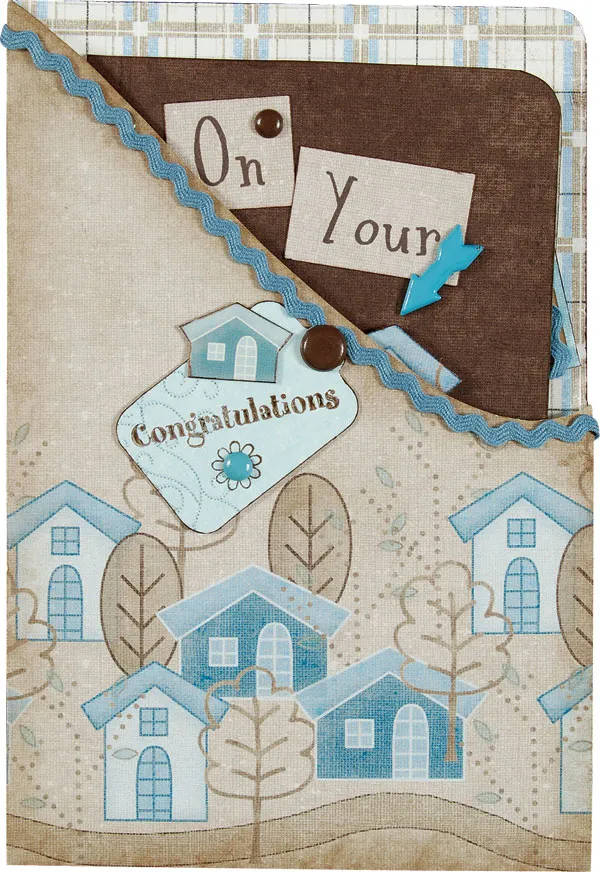 Chalk the edges of the front piece with brown chalk. Punch out the blue swirl tag and stamp “congratulations” across it and a flower below the word. Ink the edges. Add a small blue brad in the flower center. Cut a house from the cardstock border and ink the edges. Glue it to the tag as shown. Attach the tag to the upper edge of the front piece, using a brown brad.