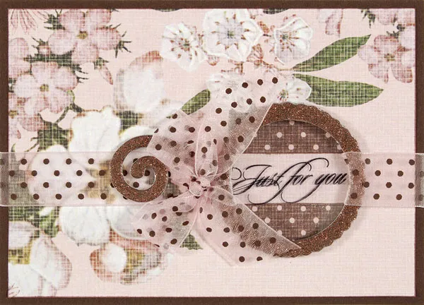 For the card front: Turn the card with the fold at the top and trim it to 4 ½”x6 ¼”. Cut a piece of brown cardstock to cover the front but don’t glue it yet. Cut a piece of the pink dogwood corner design paper to 4 ¼”x6&rdquo,; positioning the flowers as shown. Ink the edges brown and glue it centered onto the brown piece. Tack the card front onto the blank card temporarily.