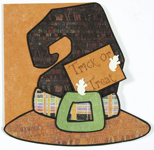 For the card front: Trace the patterns for the hat (in the free download). Cut the hat crown from black striped paper and the brim from orange stripe. Cut the headband from the plaid border section and the buckle from lime. Glue each piece to black cardstock, then cut around it, leaving a narrow black mat on all the edges.