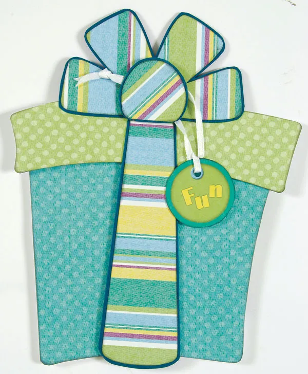 Cut the ribbon, bow, and knot from the striped paper, positioning the stripes as shown. Ink all the edges. Glue each piece to teal cardstock and cut them out, leaving a narrow mat edge. Add foam tape to the lower 3 ½” of the ribbon and adhere it vertically over the box and lid. Glue the bow near the upper edge of the lid, centered over the ribbon.