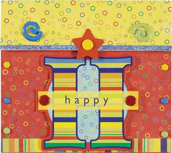Glue the “birthday” die cut centered on the yellow. Attach a candle brad at the center top, extending above the upper edge (it will be the “handle” to pull the card from the pocket). Glue the constructed card front to the cardstock piece. Write your personal message on the back and slip it inside the pocket. Glue the constructed piece onto the cardstock piece.