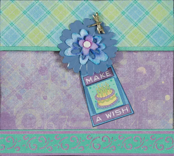 Cut out the blue tag, the “make a wish” word art, and the birthday cake. Cut “make a wish” apart and glue the words to the tag as shown. Add foam tape behind the birthday cake and attach it to the tag. Chalk a ½” wide felt flower and adhere it to the tag top. Fold the ribbon and glue it to the back of the tag. Use a mini brad to secure the tag to the purple piece, positioned to extend from under the blue flower. Glue the constructed piece to the lower front on the blank card.