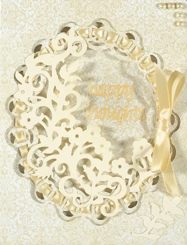 Card front: Place a blank card with the fold on left. Cover the front with Robin’s Red ivory flourishes paper. Open your card and center the largest Loopy Lace die cut on the card front. Die cut the card front only. Cover a 6½”x5” white cardstock with Robin’s Red ivory flourishes paper. Center the second largest Loopy Lace cutting die on the cardstock and run through your die cutting machine. Foam tape to the inside of the front so it shows through from the front, matching up the scallops and the cut-outs. Weave a 36” piece of cream satin ribbon through the loops, starting in the middle on a long side, and finish by tying the ends into a bow. Die cut the medium and large branches from ivory cardstock. Zot™ the larger branch around the left of the inner die-cut oval, and the medium branch next to it on the right, tucking the end under the large branch, and keeping most of the branches inside the outer oval. Glue five pearls in the top right corner as shown. Die-cut a small branch from ivory cardstock and glue to the bottom right.
