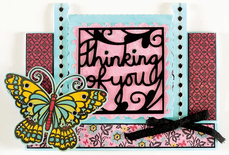 Use the inner frame die, Mirage pink textured paper, and your die-cutting machine to create a square with decorative edges. Glue centered on the front of the pop-up as shown. Cut a “Thinking of You” die-cut from Black Suede and glue centered on the pink square.