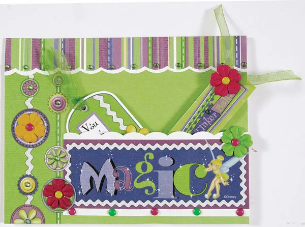 Cut out the Tinkerbell art, “you can fly!” word art, and “a sprinkle of magic” circle art. Add foam tape to the back of the circle art and attach it to the sentiment between “you” and “today!” Attach a flower to the Tinkerbell art with a brad, then glue it as shown and glue “you can fly!” above it. Add jewels among the art and words.