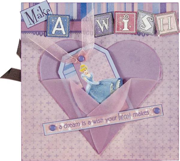 Cut out the “a dream is a wish…” word art and mat it on blue. Ink the edges then attach it to the border piece with brads, placing it across the heart pocket to secure the flaps closed. Glue the constructed piece to the blank card front.