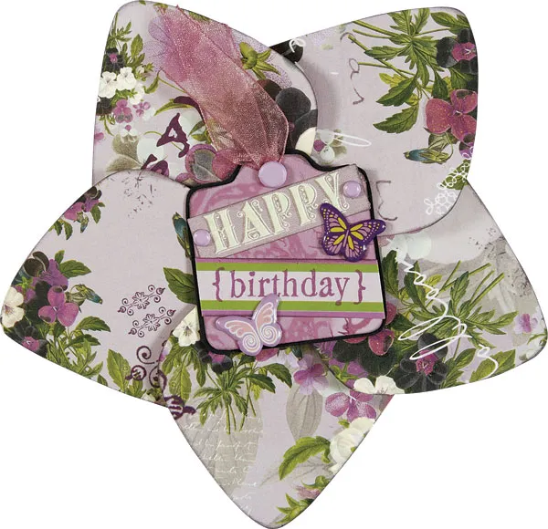 For the card outside: Place the Giant Star Card template on the back of the glittered violets paper and lightly draw around the large star. Cut it out, fold it on the fold lines, then ink the edges black.