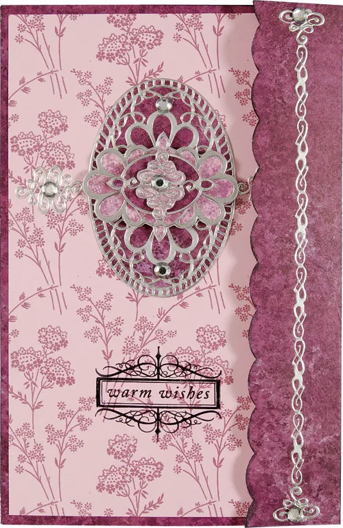 Place the oval designs on the pink shine paper front, stacking them as shown. Add a 1” Dazzle on each side of the oval. Stamp “warm wishes” below the oval and let dry. Add five rhinestones to the Dazzles on the front, positioned as shown.