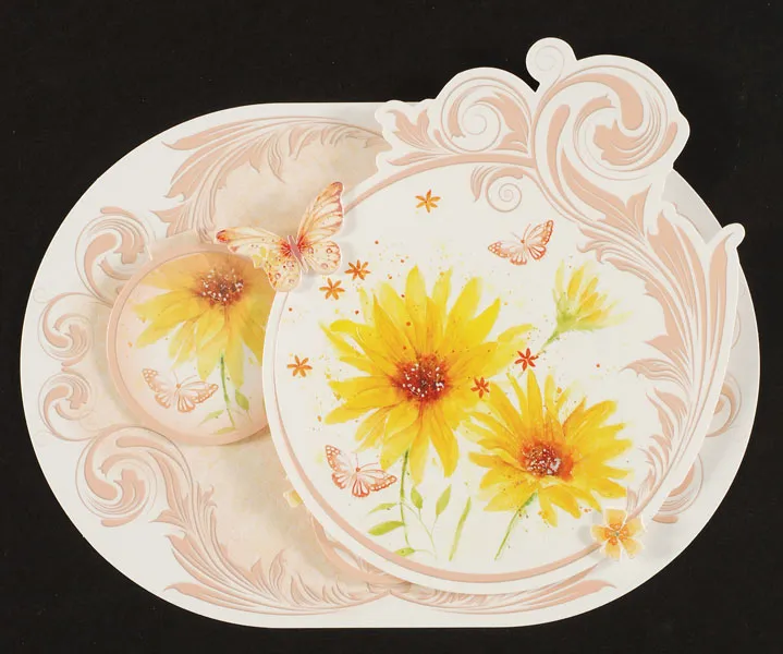 Pop out the large yellow flower circle die-cut, two large and two small butterflies and two small yellow flower die-cuts from the “Flourishing Blooms” die-cut sheet. Remove paper nibs as before.