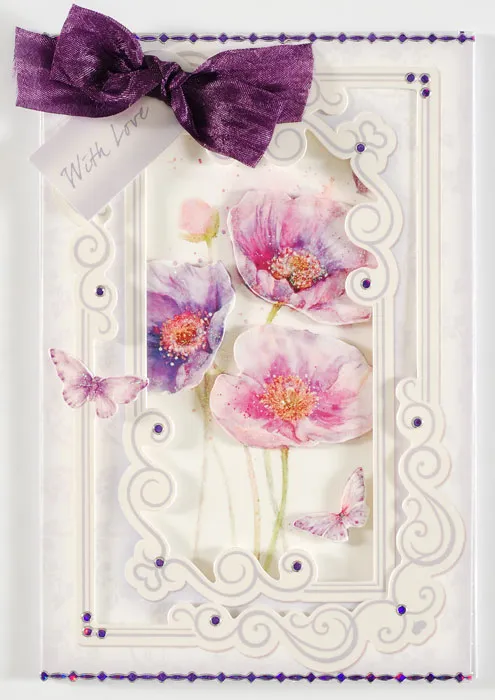 Place Jewel Border Dazzles™ on the top and bottom edges of the card front and on the right side of the second panel. Place small Jewel Dazzles™ on the swirls and corners of both windows as shown. Use 3/4" wide purple crepe ribbon to tie a bow. Zot™ the bow and “With Love” tag near the top left.