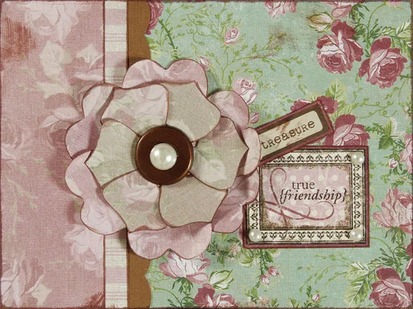 Mat the “true friendship” art on burgundy texture paper and ink the edges. Repeat with the “treasure” art. Glue the two pieces to the front as shown. Attach small pearls to the art and the large pearl to the brad center.