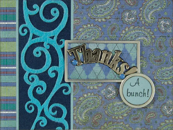 Cut a blue/teal argyle paper piece to fit inside the rectangular tag. Ink the edges and glue it in place. Position the “Thanks!” and attach it with the brads. Add foam tape to the back of the tag, then adhere it to the card front as shown.