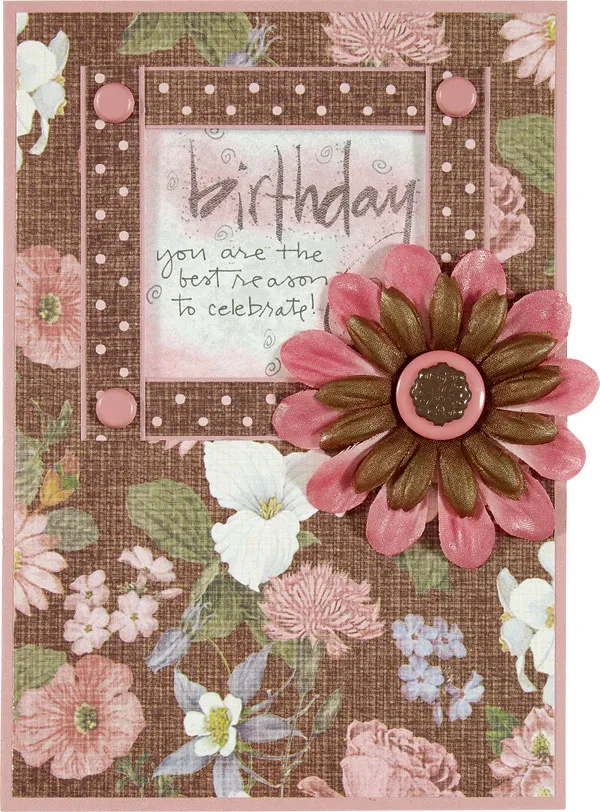 Cut a 3/8”x12” strip of the brown/pink dots paper and mat it on rose. Cut it into four 3” lengths. Glue one each along the upper and lower edges of the window. Cut two more 3” lengths and glue one along each side of the window. Add a pink brad to three corners as shown.
