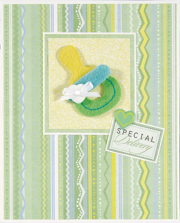 Cut a 2”x2 ¼” piece of yellow texture paper and mat it on mint, then again on white. Glue the pacifier at an angle on this piece, slightly shifting it toward the upper left corner. Cut out the “special delivery” art and mat it on white. Glue it to the lower right corner of the yellow piece, angled as shown. Add a mint heart brad, then glue this constructed piece to the card front, positioning it as shown.