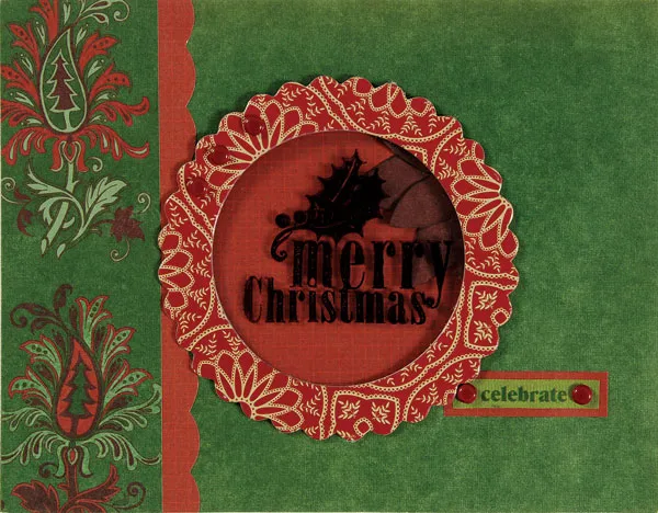 Position the frame centered on the card front and lightly trace the inside circle. Open the card and cut out the circle. Stamp “merry Christmas” onto the acrylic circle. When it dries, glue it to the back of the frame. Add three mini brads to the upper left area of the frame, then glue the frame and acrylic piece over the circle opening in the card front.