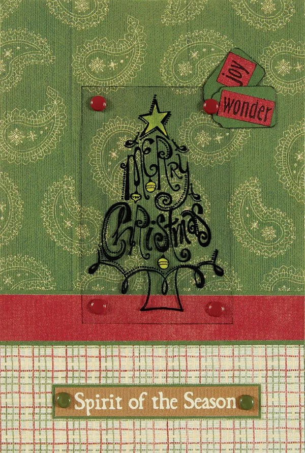 Cut out the “spirit of the season” art and mat it on green. Attach it to the plaid area with green brads as shown. Glue the constructed front piece to the blank card front.