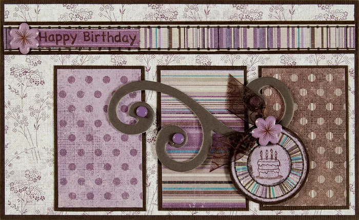 Stamp “happy birthday” on the stripes paper in a wide purple stripe and cut it to 2”x3/8”. Glue it at the left end of the border, then add a flower brad as shown. Glue the constructed sprigs piece to the blank card front.