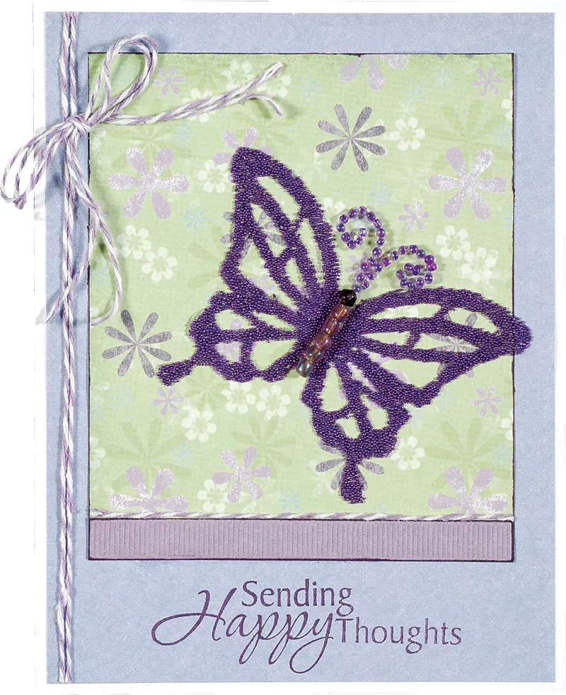 Place butterfly angled on the card front as shown. Add body and antennae stickers to the butterfly. Carefully place 6 small beads along the center of the butterfly, with the top one slightly darker than the rest. Place smaller purple beads on the rest of the antennae.