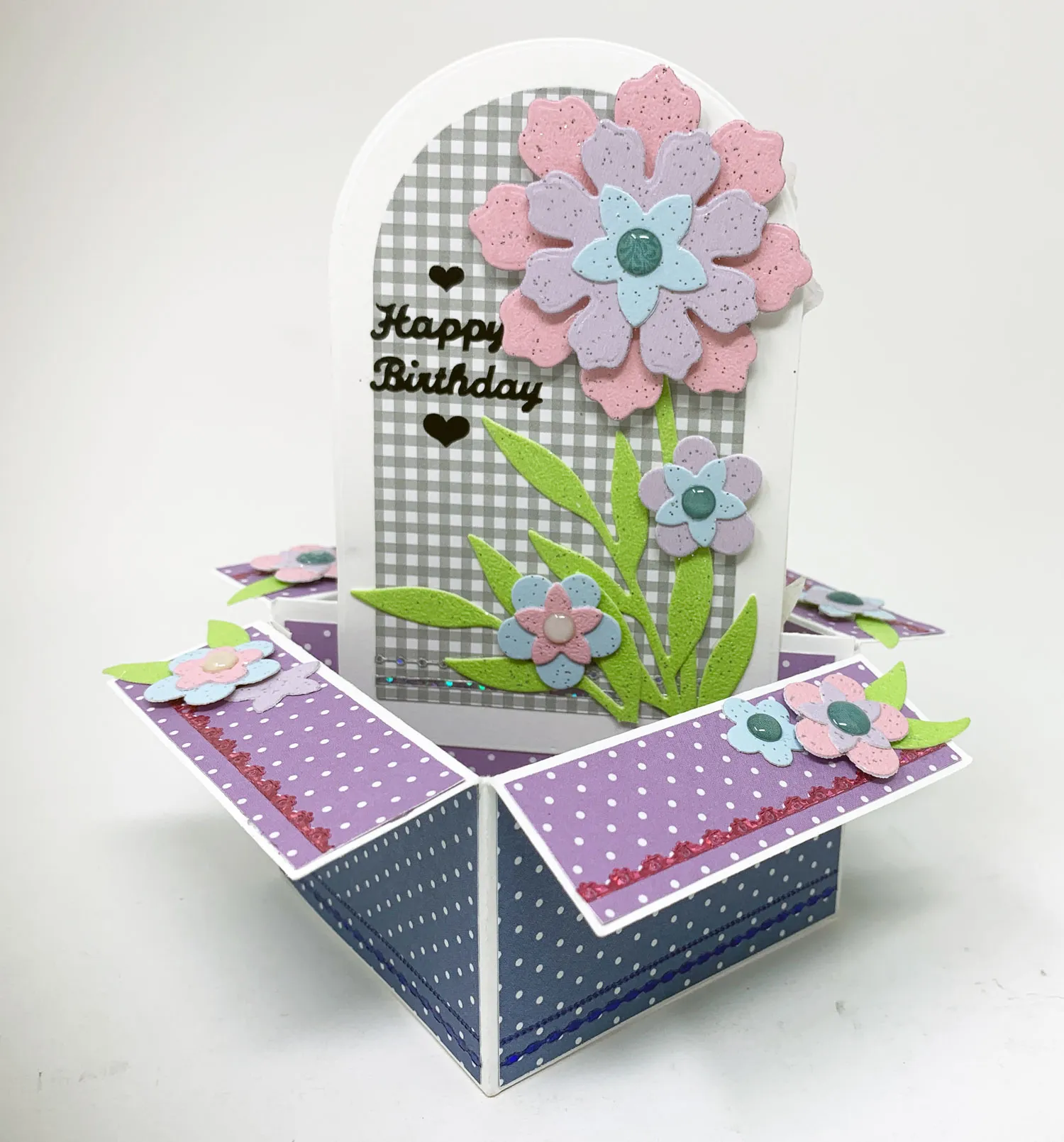 Die cut large stems and leaves from green glitter cardstock. Glue the stems, leaves, and foam tape the flowers to the arches as shown. Place black “live,” “laugh,” and “love” Dazzles™ on one arch and “happy birthday” Dazzles™ on the other arch as shown.