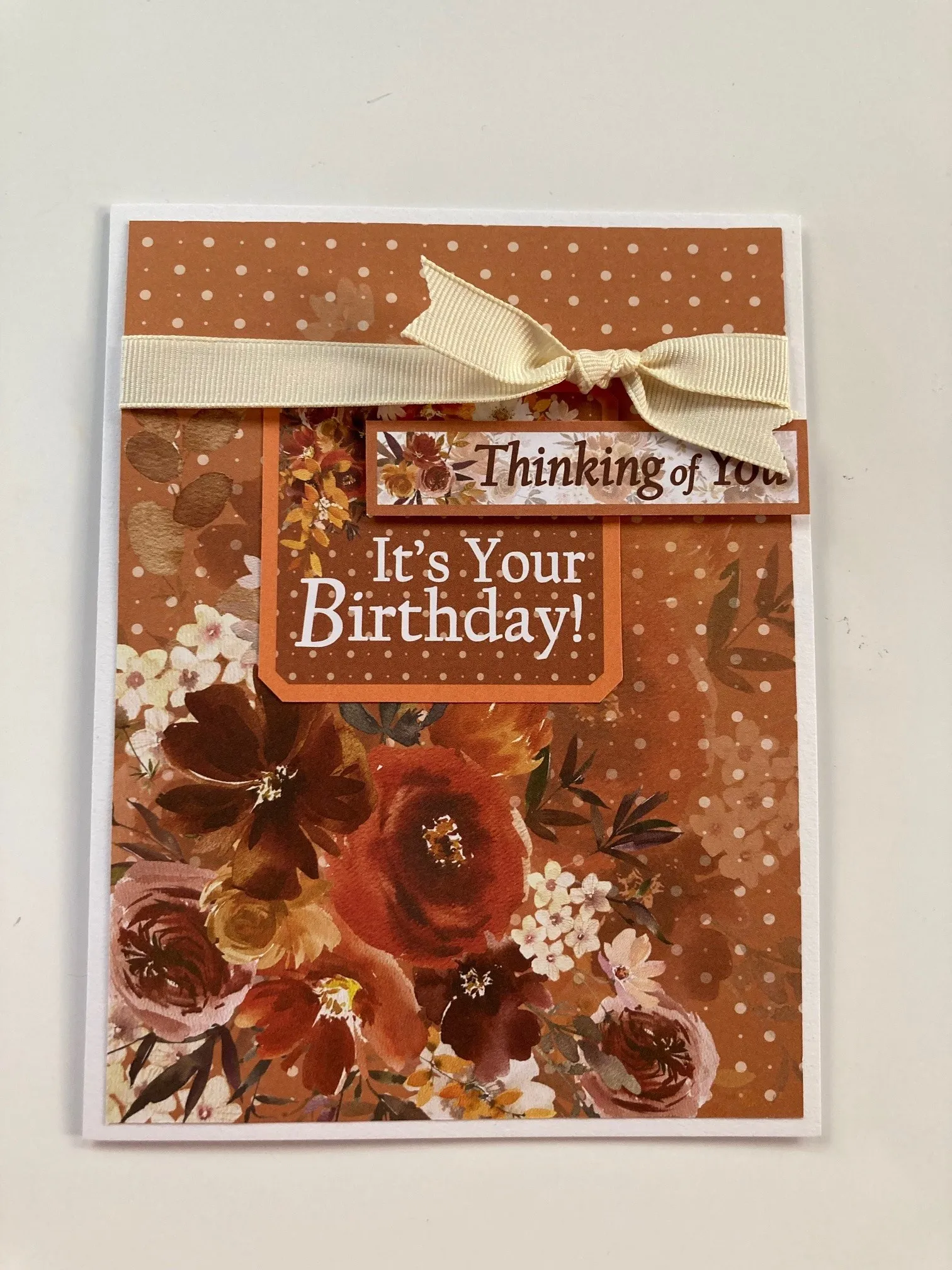 4. Cut out the Autumn Garden “it’s your birthday” and glue it tucked under the ribbon as shown. Cut out the “thinking of you” label and foam tape it below the knot and overlapping the first label as shown.