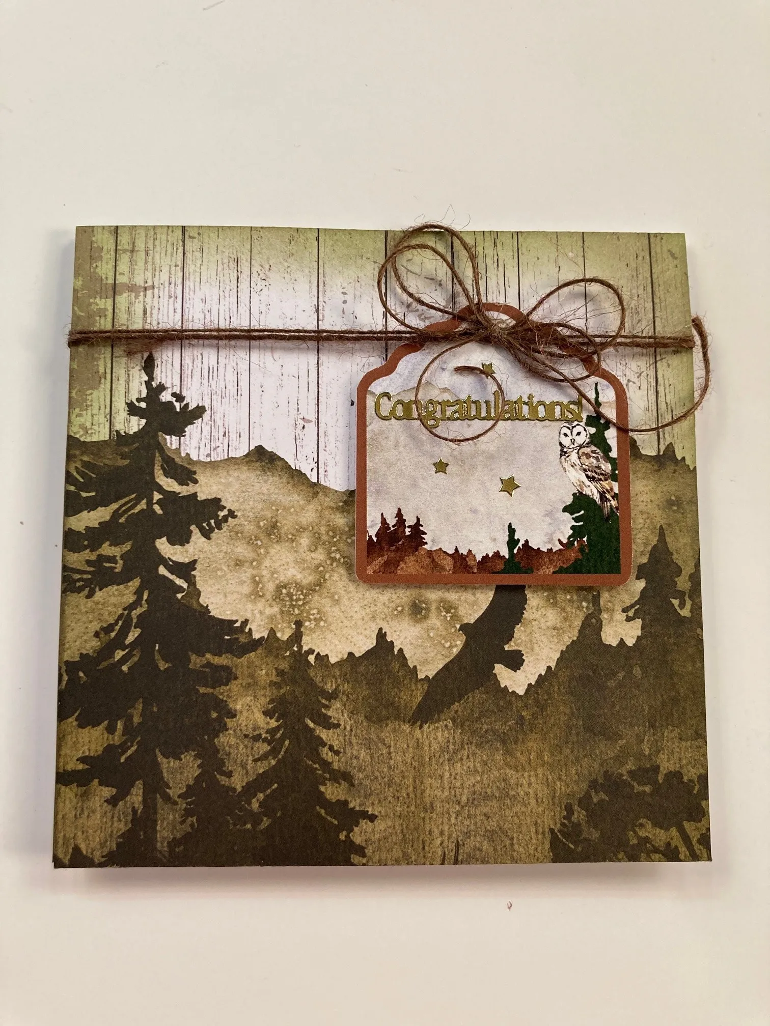 4. For the card front: Cut 5"x5" Wood & Woodland white boards cardstock with the trees at the lower left. Ink the edges first with Khaki, then with Muddy Boots inks. Wrap two strands of brown jute over the cardstock 1" from the top and glue the ends to the back. Glue the cardstock on the card front.