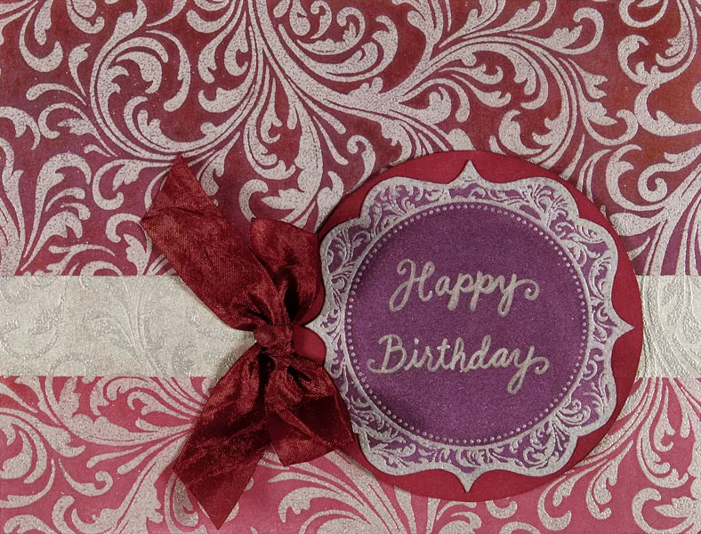 Cut out the scallop circle label from the Color Me™ papers and color with Blackberry ink. Write “Happy Birthday” in the circle with a silver metallic marker. Use a compass to cut a 3 1/4” diameter circle from white cardstock and ink the circle with maroon ink. Glue the label to the center of the circle. Foam tape the circle to the card 1/2” from the right and 1/4” from the bottom. Tie a small bow of burgundy crepe ribbon and Zots™ it to the left of the circle.