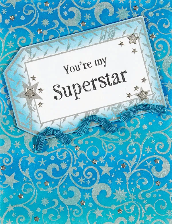 Cut out the steel/stars tag about 1/16” around the silver border and print a greeting on it. Apply Deep Lagoon ink lightly with the blender tip all over the tag. Ink the edges of the tag black and foam tape to the card tilted, centered 1” from the top. Tie 3 small knots from teal metallic ribbon and attach them with Zots™ in a row beneath the tag.