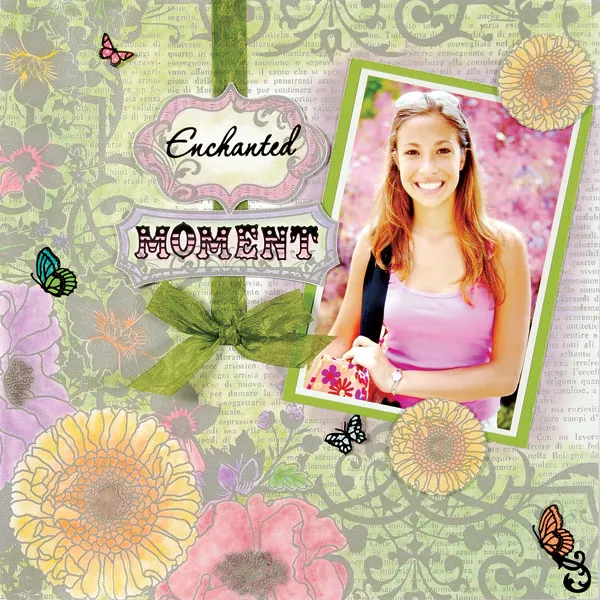 Adhere “Enchanted” and “Moment” Dazzles™ to the two frames and foam tape to the page centered on the ribbon. Color in “Moment” spaces with chalk. Back butterflies with “Serendipity” paper and Zots™ to the page. Foam tape extra flowers to the page.