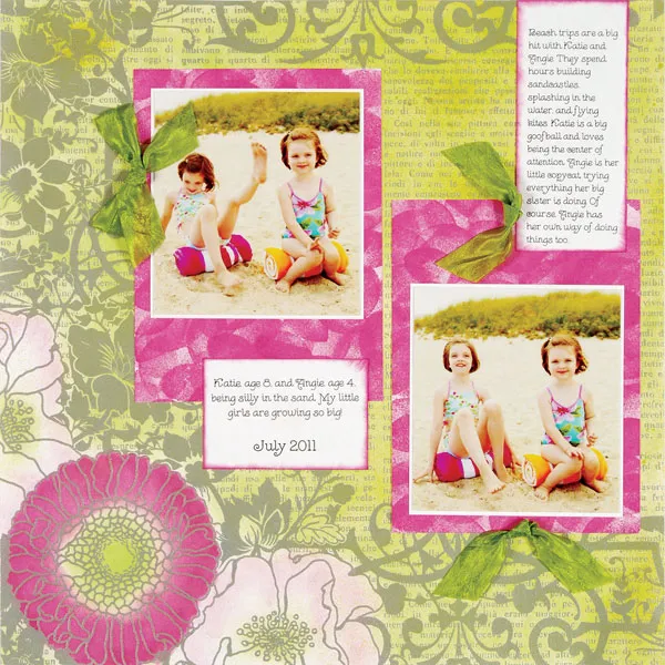 Tie a small bow from green crepe ribbon and Zots™ to the left of the left photo. Zots™ a small knot of ribbon to the bottom left of the upper journaling block and centered at the bottom of the right photo.