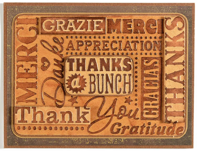 Cut “grazie,” “thank&rdquo,; and “thanks” from the tan embossed panel and round the corner next to the ‘s’ on ‘thanks.’ Ink the edges with Dark Brown, then foam tape each word as shown.