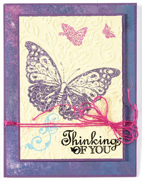 Cut 4¼"x6" ivory cardstock. Stamp the largest butterfly on it, angled as shown. Cover with Mauve embossing powder, tap off the excess, and heat to melt. Stamp and emboss the swirl below the butterfly with Ice Blue powder. Stamp and emboss the two small butterflies near the top as shown with Pink Fizz.