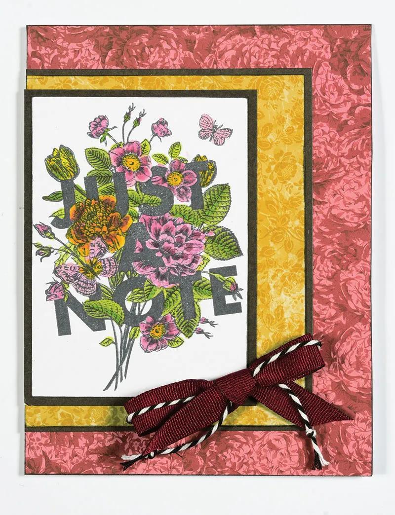 Stamp the “JUST A NOTE” and tiny butterfly images onto white cardstock and color leaves with Green Spectrum Noir® Pens and add dark Red Spectrum Noir® Pen to the large and medium flowers. Color flowers and butterflies with Pink and Yellow Spectrum Noir® Pens and blend. Cut to 3”x4 3/8” and mat with black cardstock, leaving 1/8”. Glue even with the left side of the card. Hold lenths of Sunday Musings burgundy grosgrain and black and white baker’s twine together and make a bow. Zot™ to the lower right corner as shown.