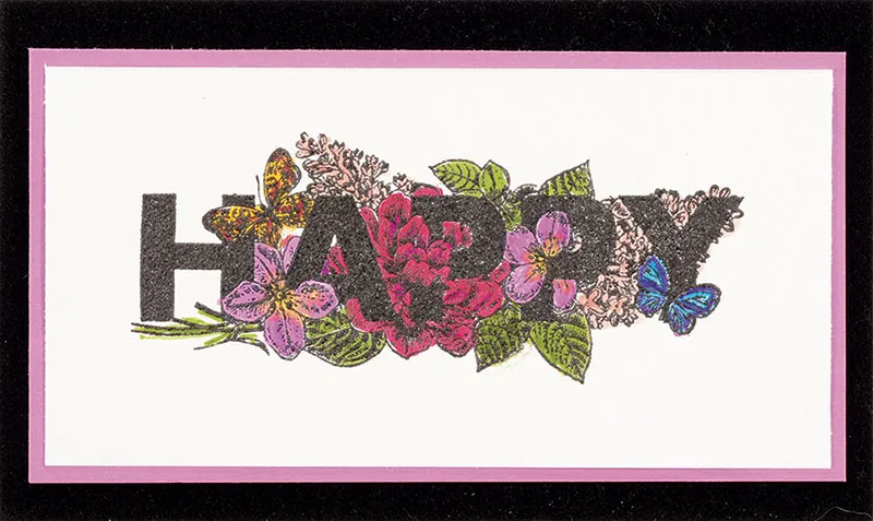 Stamp the “HAPPY” in VersaMark™ ink on a 4½”x2¼” white cardstock. Dust with black embossing powder. Tap off the excess. Heat with the heat tool.
