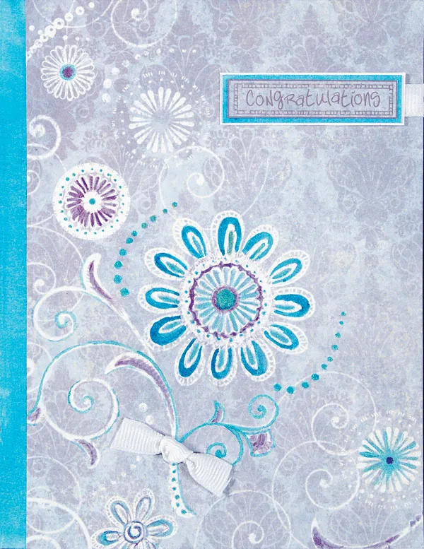 “Paint” diluted Azure onto white cardstock as you did for the edge of the card front, and let dry. Glue “congratulations” label to the painted cardstock, trim, then mat again on white. Add white ribbon tab to the end and glue to the upper right portion of the card front. Zot knotted ribbon as shown.