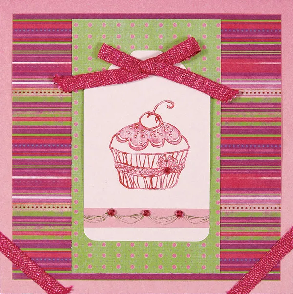 Trim the card to a 5” square. With the fold at the top, cover the card front with dark pink paper or cardstock. Glue a 4 ½” pink/green/purple/red striped square centered on the card front. Glue a 2 ½” x 4 ¼” green/pink dotted rectangle vertically centered over the striped paper.